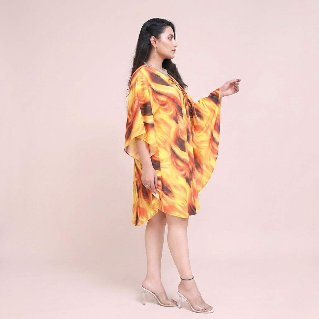 Make a bold fashion statement with this abstract printed polyester kaftan, designed with vibrant tones and a modern artistic pattern. Perfect for women who love standout styles, this kaftan is ideal for beachwear, resort wear, holiday outfits, and casual summer fashion.