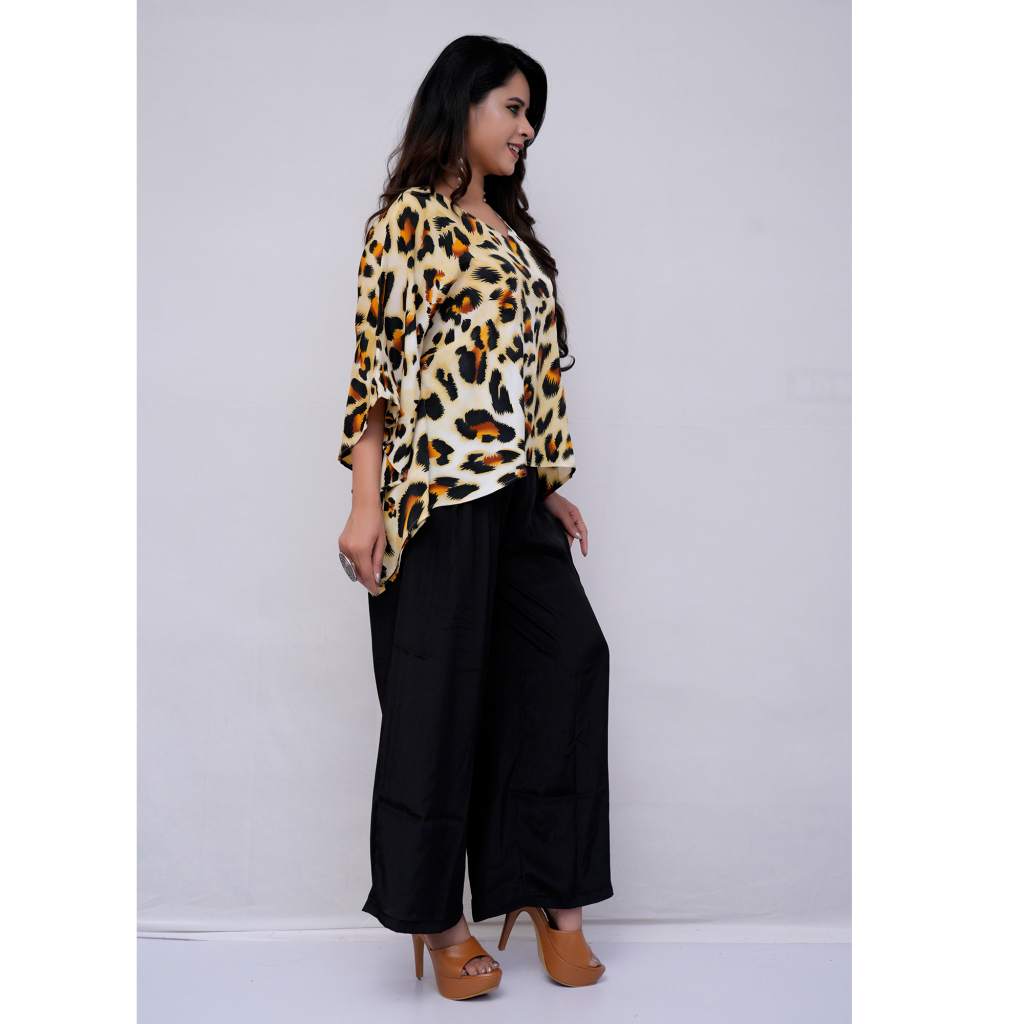 Fierce and fashionable, this animal print kaftan top paired with crepe pants is perfect for bold style lovers. The free-size polyester kaftan top flows beautifully, while the crepe pants offer a flattering fit—ideal for casual chic or resort looks.