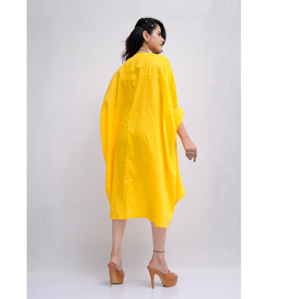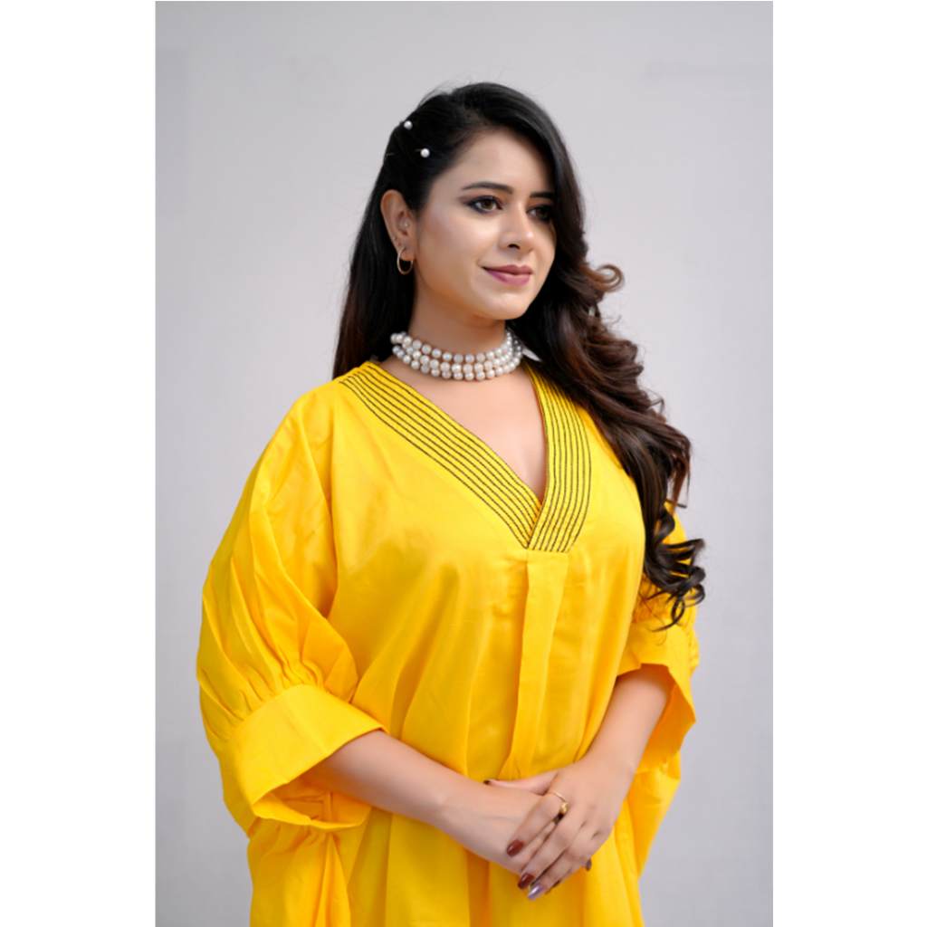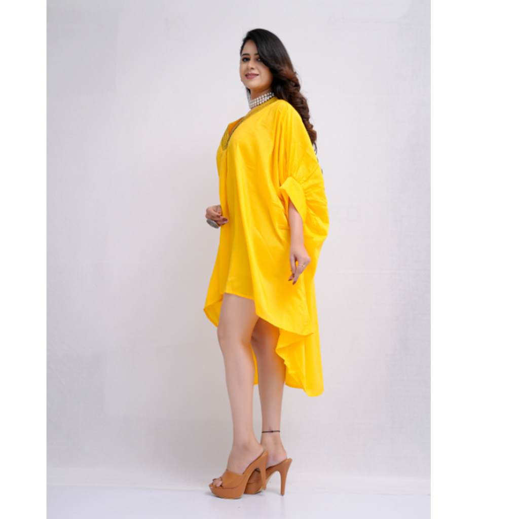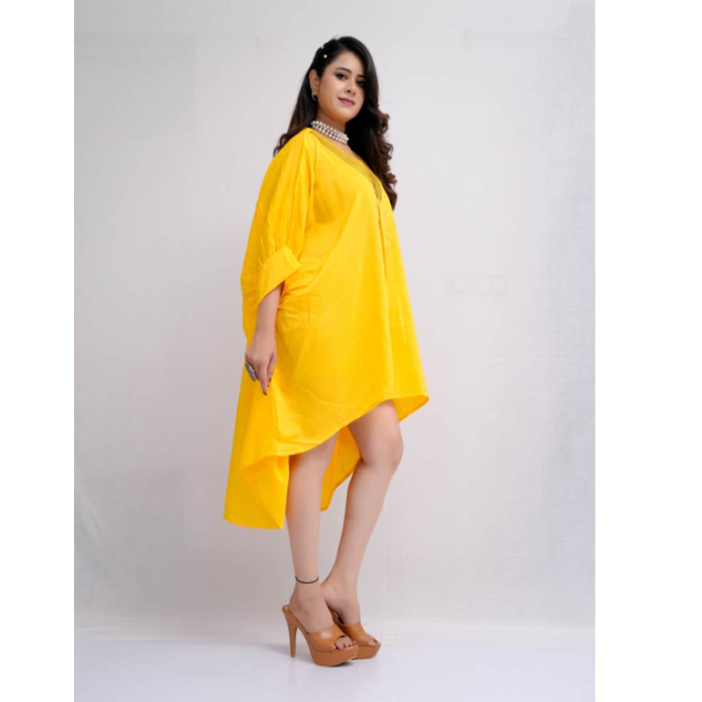Elevate your style with this vibrant yellow high-low kaftan, crafted from soft and flowy muslin fabric. The outfit features a designer V-neckline with intricate detailing, adding a chic touch to its modern silhouette. Its asymmetric hemline gives a trendy high-low effect, making it perfect for both casual outings and festive occasions. Designed in a free size fit, it offers effortless comfort and style for all body types.