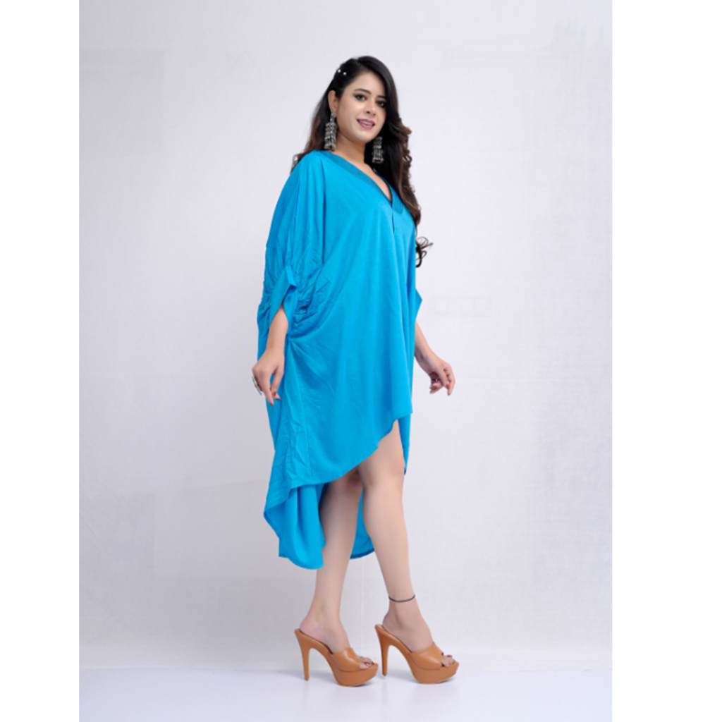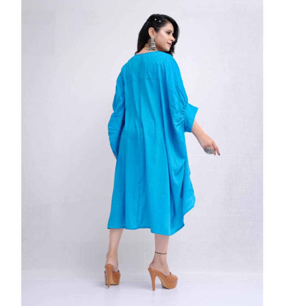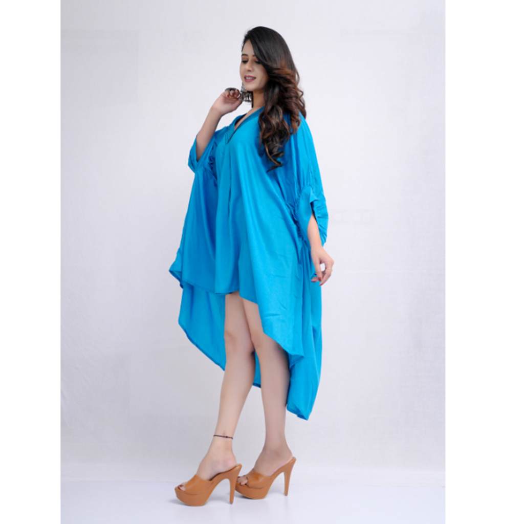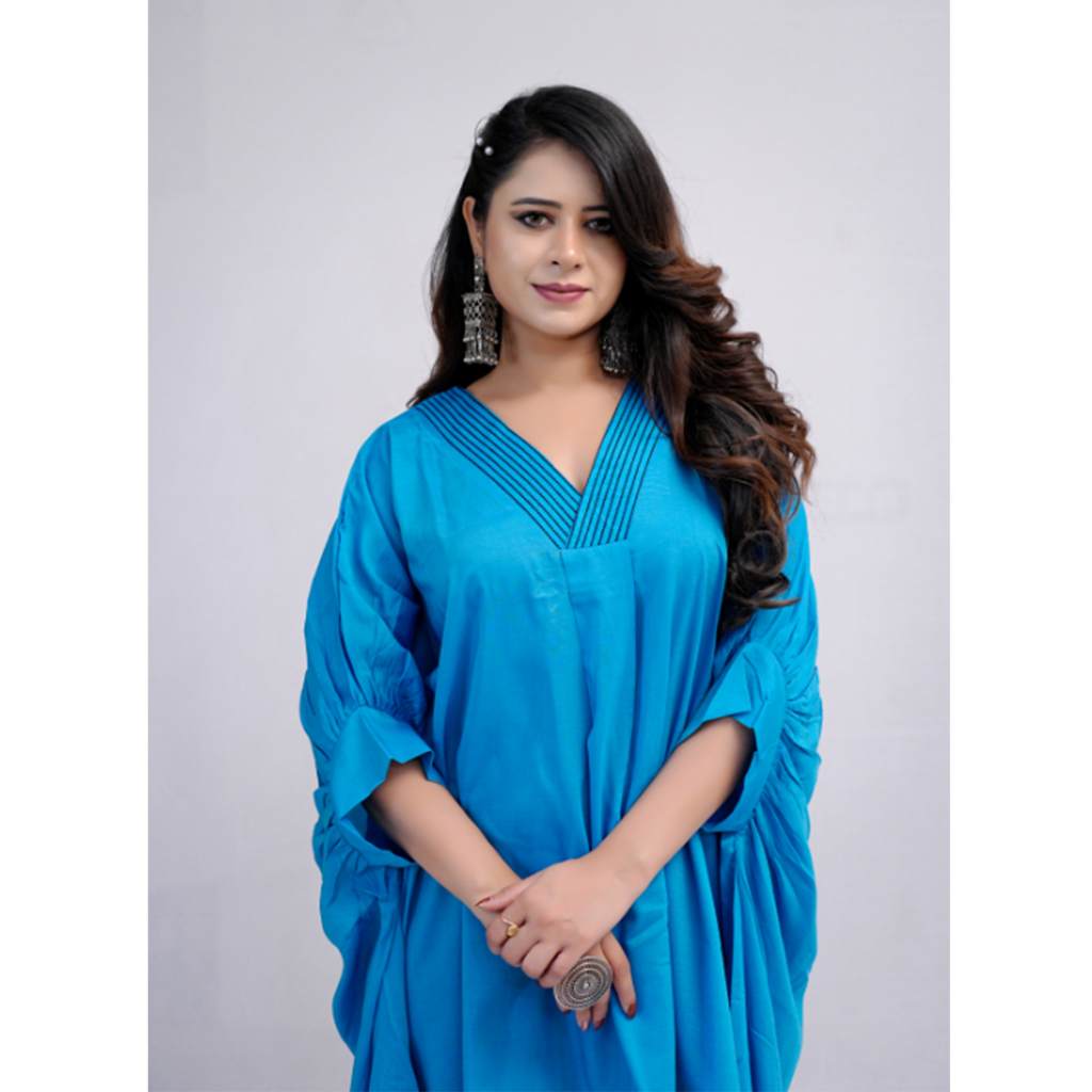 Elevate your style with this Blue high-low kaftan, crafted from soft and flowy muslin fabric. The outfit features a designer V-neckline with intricate detailing, adding a chic touch to its modern silhouette. Its asymmetric hemline gives a trendy high-low effect, making it perfect for both casual outings and festive occasions. Designed in a free size fit, it offers effortless comfort and style for all body types.