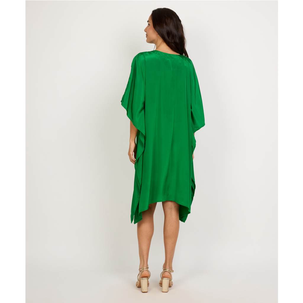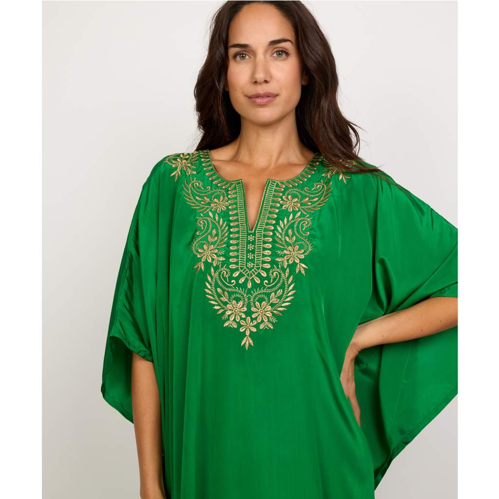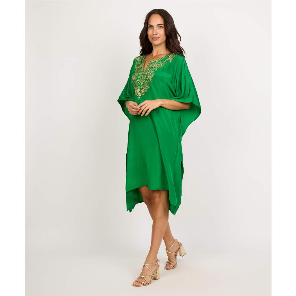 Elevate your style with this stunning green kaftan, crafted from soft and flowy Crepe Silk fabric. Featuring a beautifully embroidered designer neckline, this free-size kaftan offers both comfort and elegance. The relaxed silhouette and asymmetric hemline make it perfect for casual outings, festive gatherings, or vacation wear. Pair it with heels or flats for a chic, effortless look.
