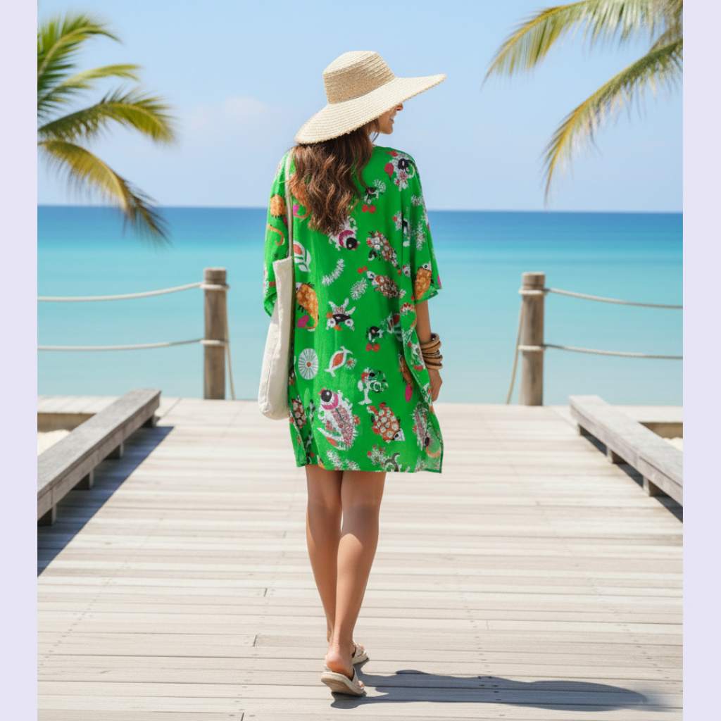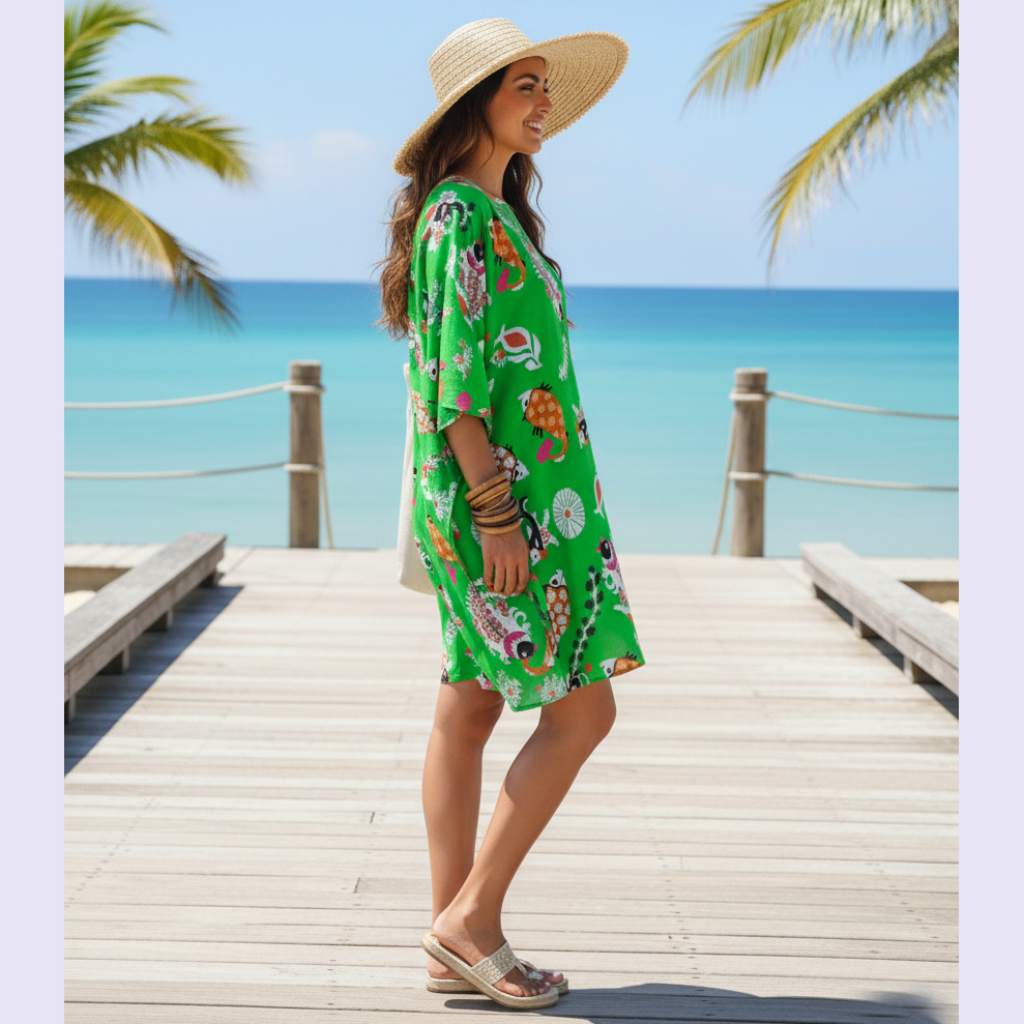 Perfect for beach holidays in Ibiza, Mallorca, Tenerife, Marbella, and coastal Spain, this kaftan works beautifully as a beach cover-up, resort wear, poolside dress, cruise outfit, or casual summer wear. The fresh tropical fish design adds a unique and luxurious touch, making it ideal for modern women seeking comfort and stylish resort fashion.