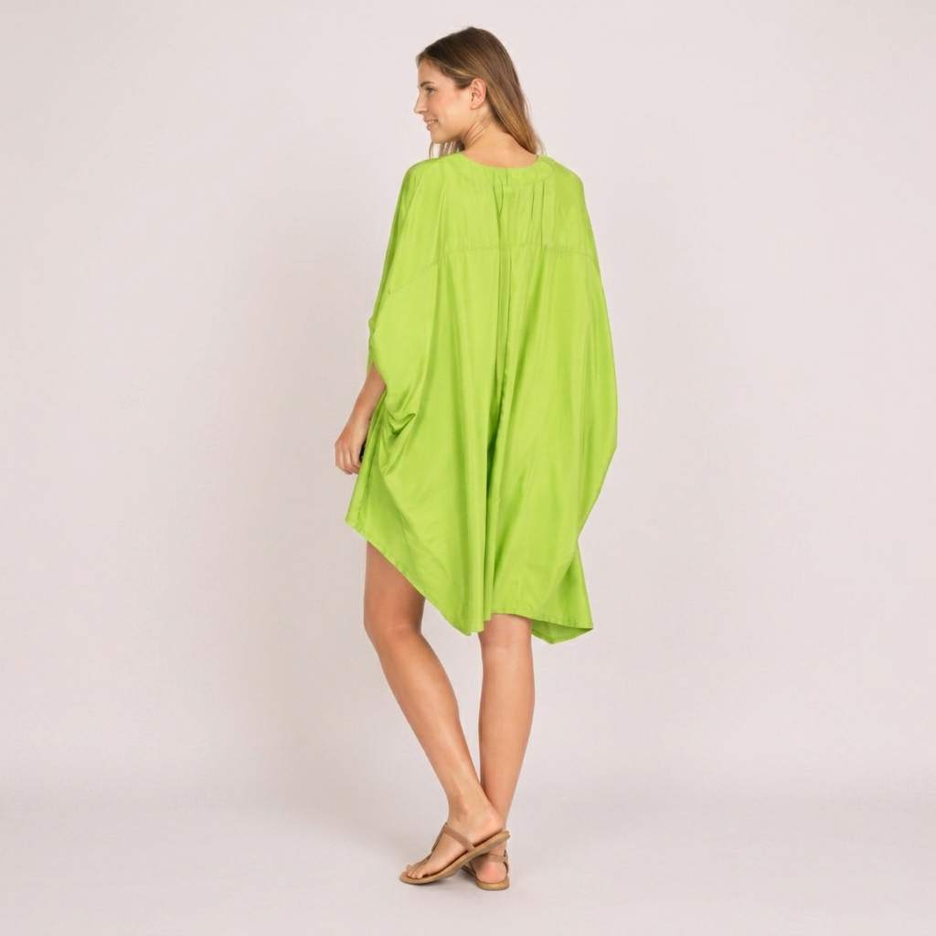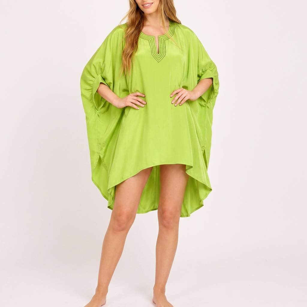 Refresh your summer collection with this vibrant lime green crepe kaftan dress from Sun-Rose Fashions. Featuring a bright, eye-catching color and a relaxed flowing silhouette, this kaftan is perfect for beachwear, resort wear, and casual summer styling.