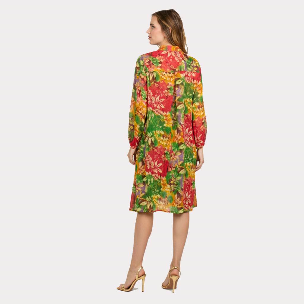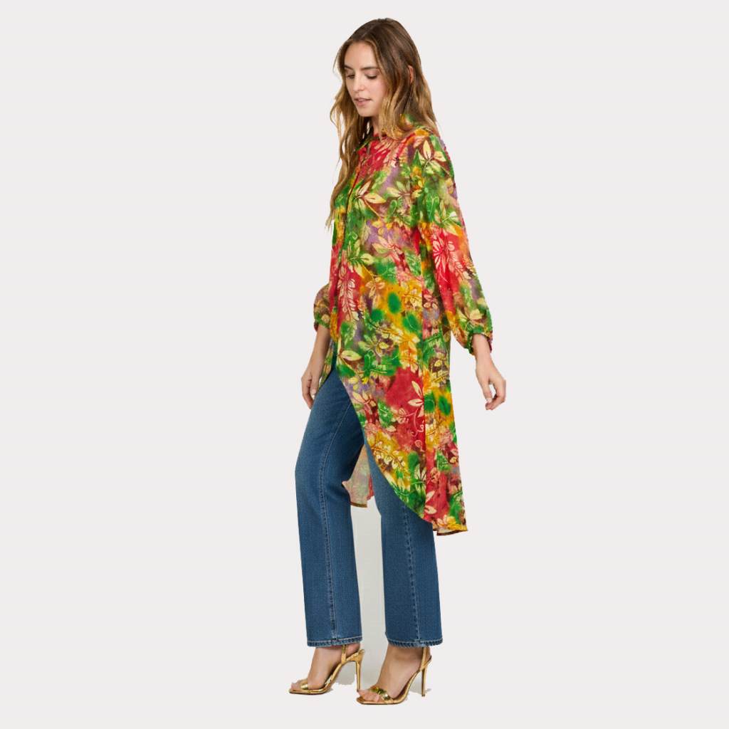 Add vibrant elegance to your wardrobe with this multicolor tropical print georgette high-low kurta shirt from Sun-Rose Fashions. Designed with a beautiful blend of red, green, and tropical nature-inspired patterns, this kurta shirt offers a modern and artistic look perfect for casual wear, resort fashion, and summer styling in Spain.
