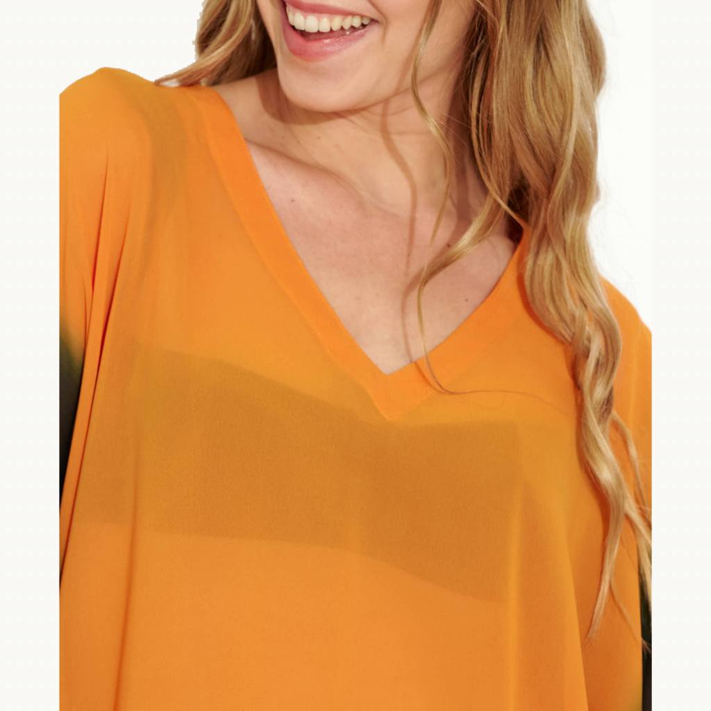 Make a bold beachside statement with this elegant orange and black georgette kaftan dress from Sun-Rose Fashions. Featuring a vibrant orange base with contrasting black side panels, this kaftan offers a modern and sophisticated look inspired by Mediterranean beach and resort fashion.