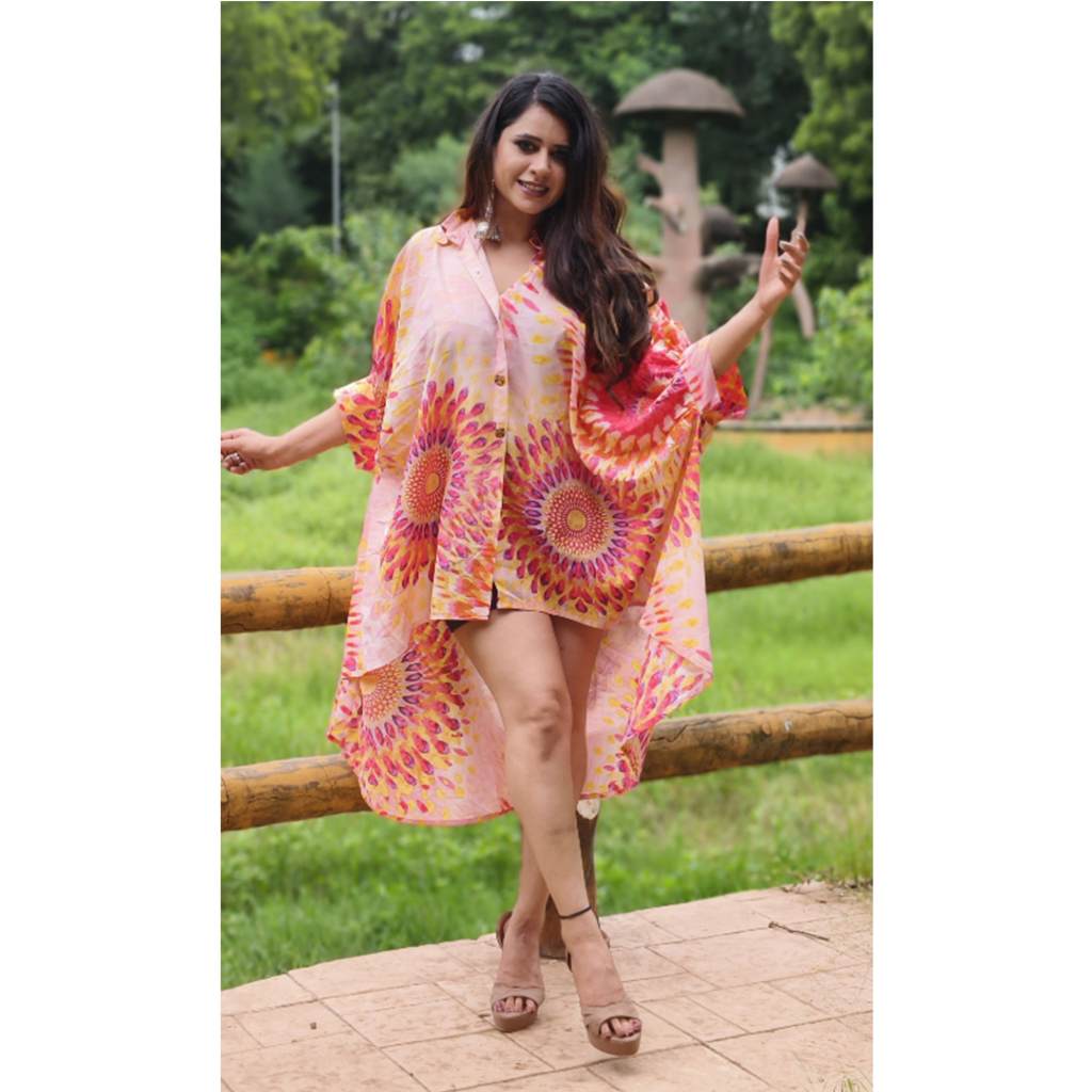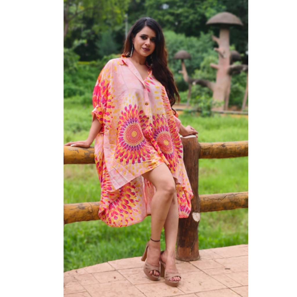 Elevate your style with this Pink high-low kaftan, crafted from soft and flowy Cotton fabric. The outfit features a designer V-neckline with intricate detailing, adding a chic touch to its modern silhouette. Its asymmetric hemline gives a trendy high-low effect, making it perfect for both casual outings and festive occasions. Designed in a free size fit, it offers effortless comfort and style for all body types.