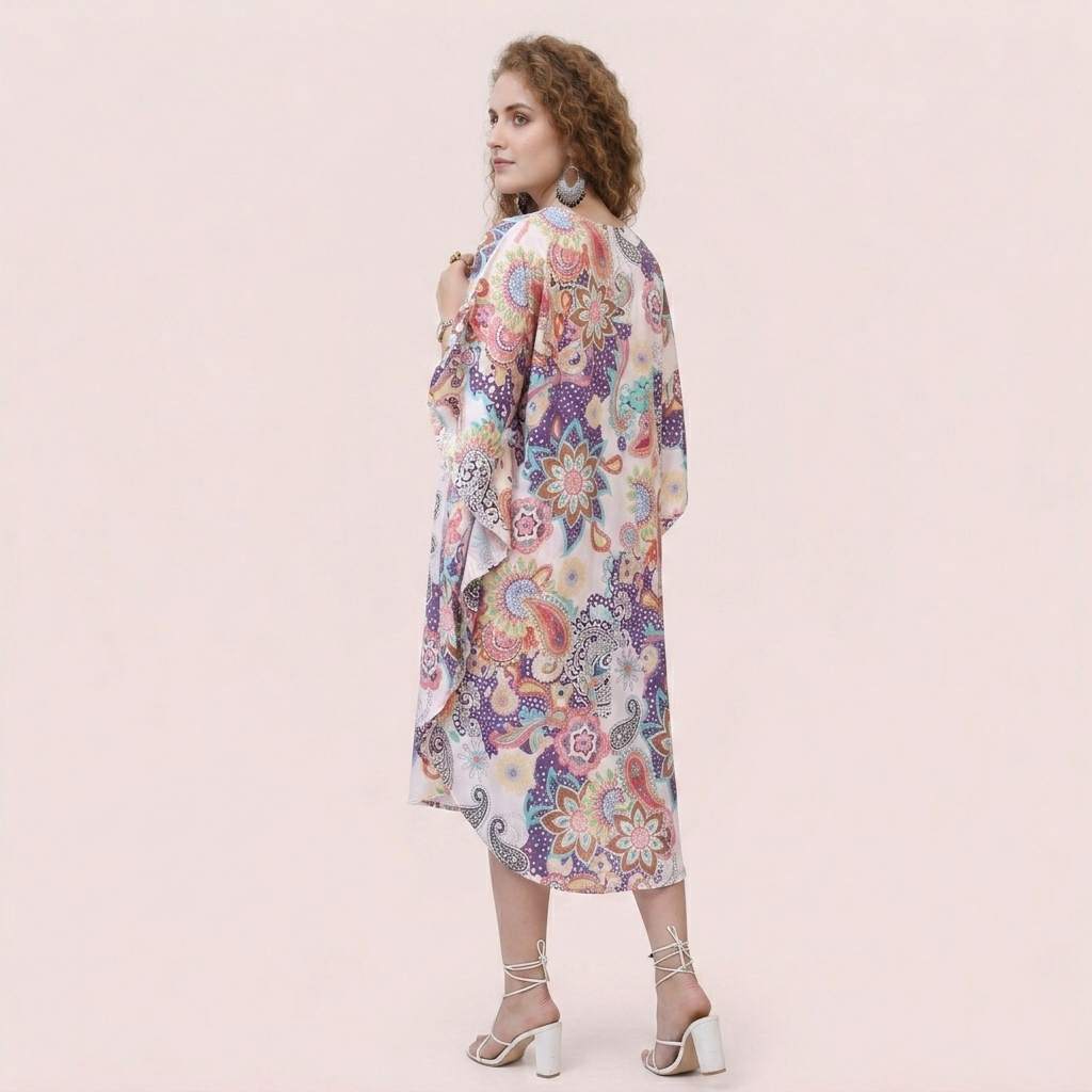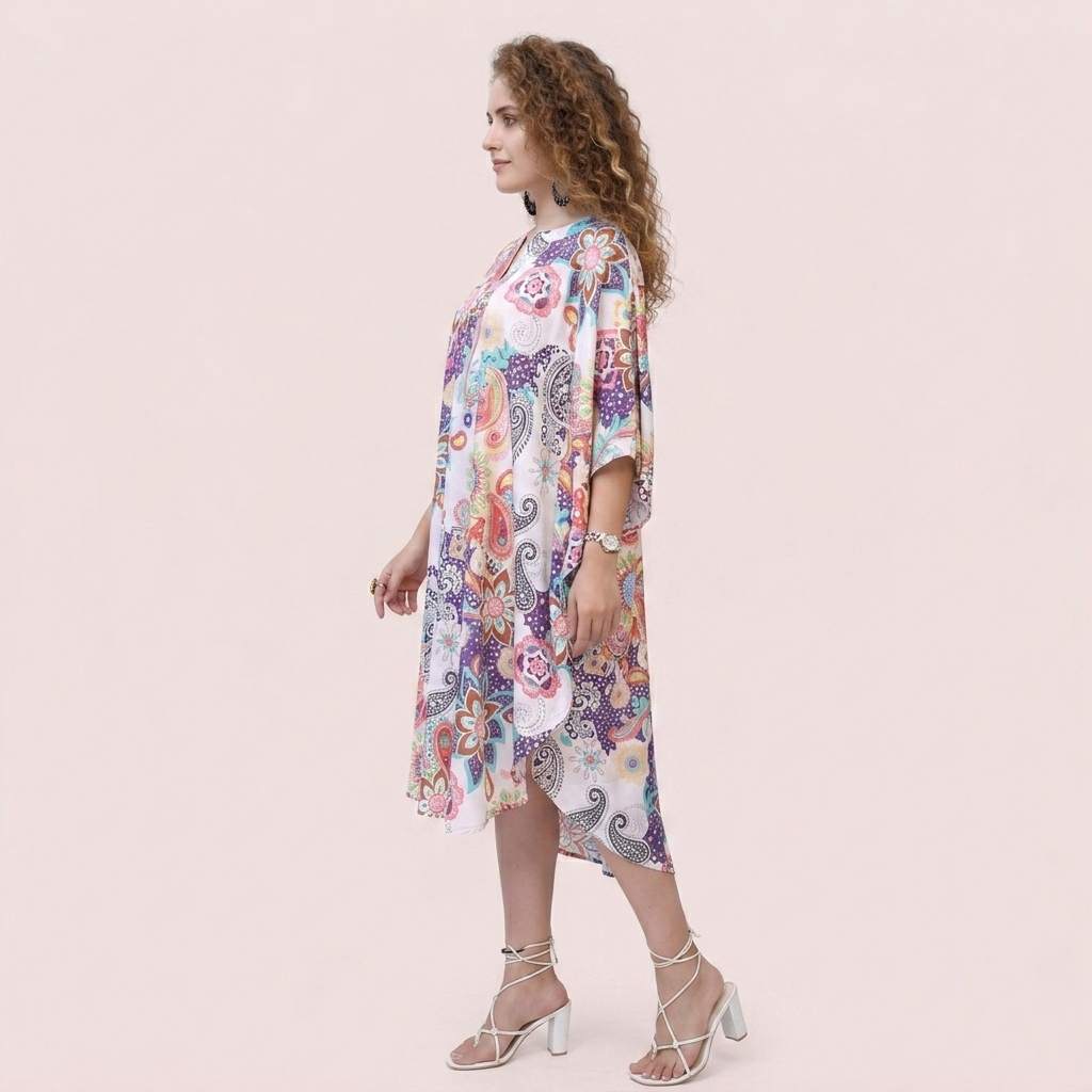 Add vibrant charm to your collection with this printed polyester kaftan featuring a colorful floral and paisley design. Designed for effortless elegance, this kaftan is perfect for beachwear, resort wear, holiday outfits, and casual summer styling.