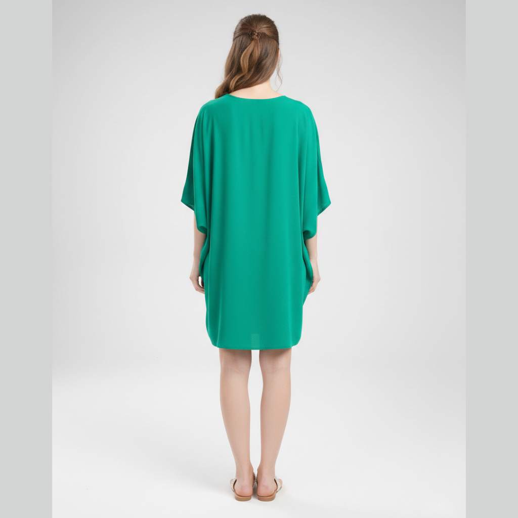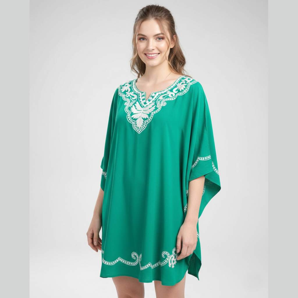 The classic embroidery and rich green color create a refined and stylish look, making this kaftan suitable for both daywear and evening resort occasions.