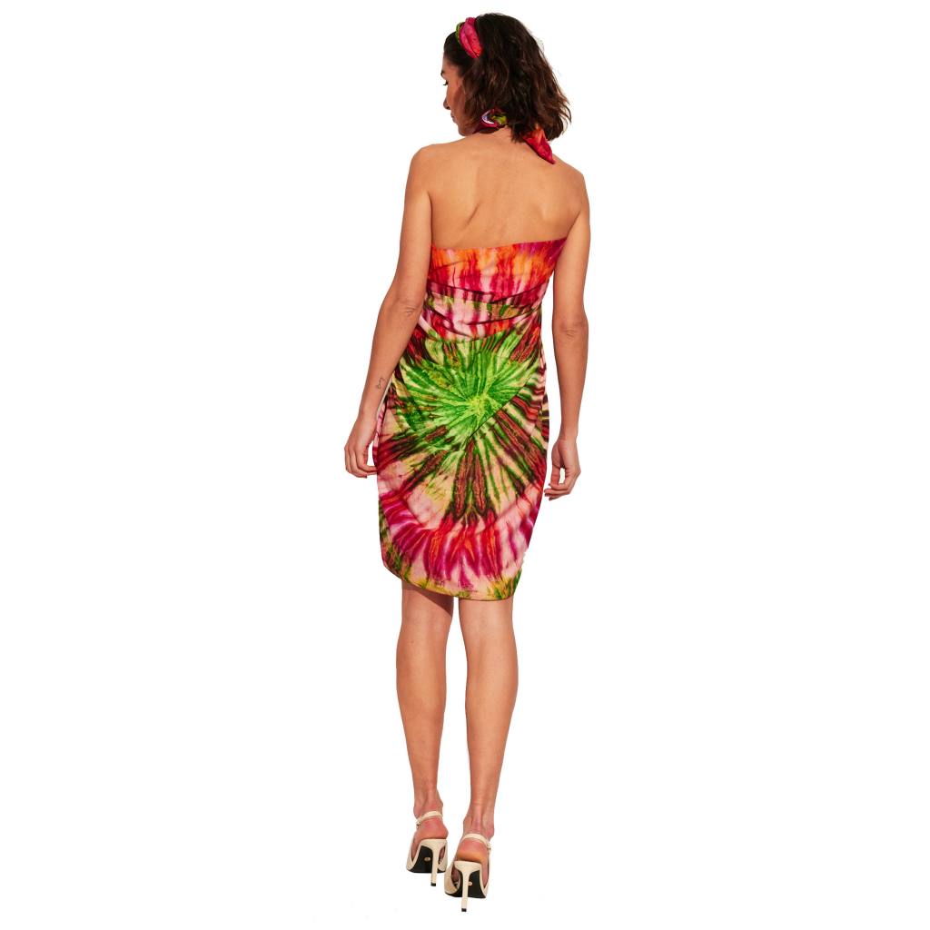 Vibrant Print: Eye-catching tie-dye pattern in tropical shades of red, orange, and green for a bold, fun look.