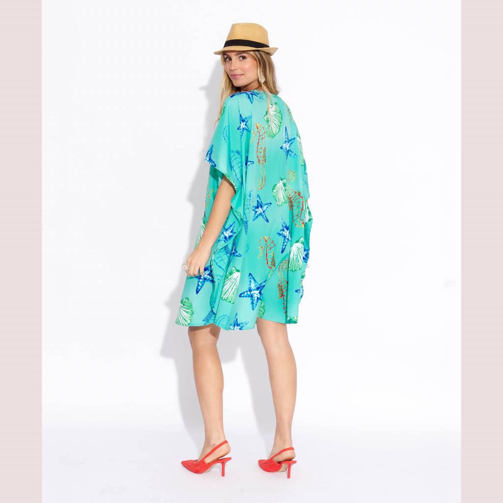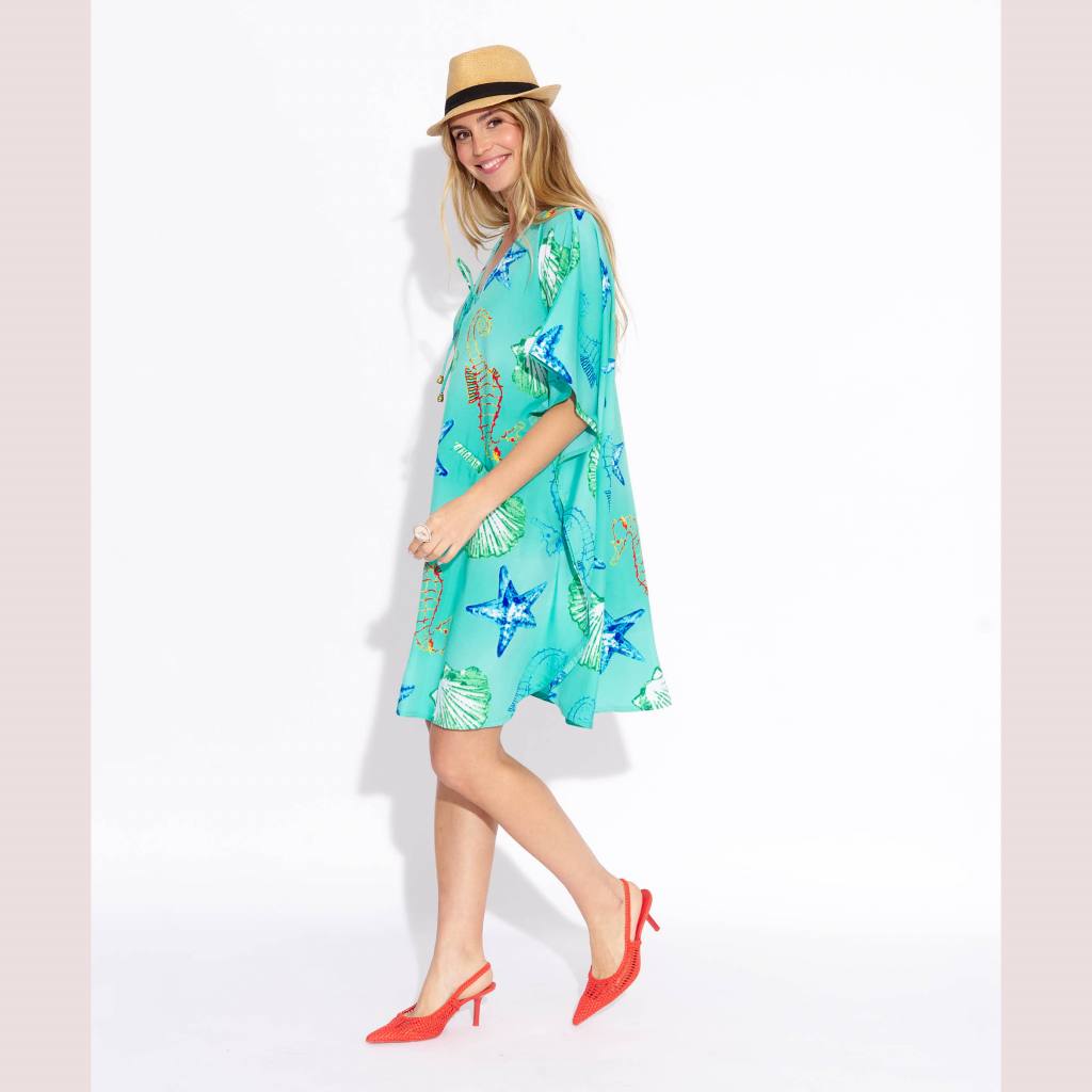 Bring the beauty of the Mediterranean Sea to your wardrobe with this stunning turquoise sea life print polyester kaftan dress from Sun-Rose Fashions. Featuring elegant marine-inspired designs including starfish, seashells, and seahorses on a refreshing turquoise base, this kaftan perfectly captures the spirit of Ibiza and coastal resort fashion.