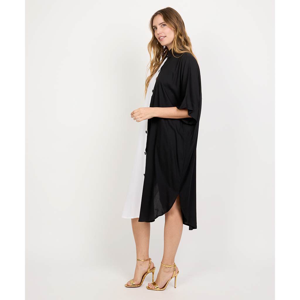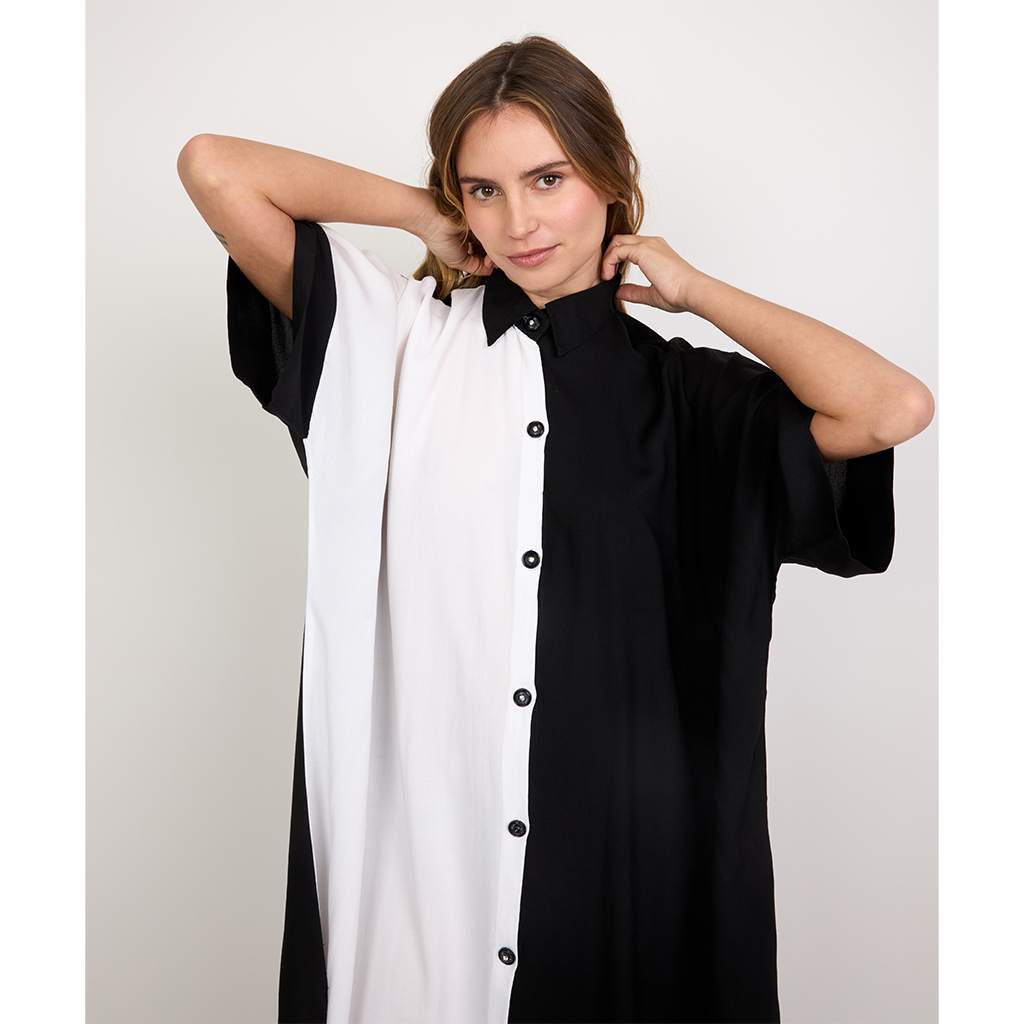 Turn heads with this bold black-and-white colorblock shirt dress crafted from soft rayon fabric. Featuring a button-down front and a smart collar, this knee-length dress combines minimalism with modern flair—perfect for casual days or chic evenings out.