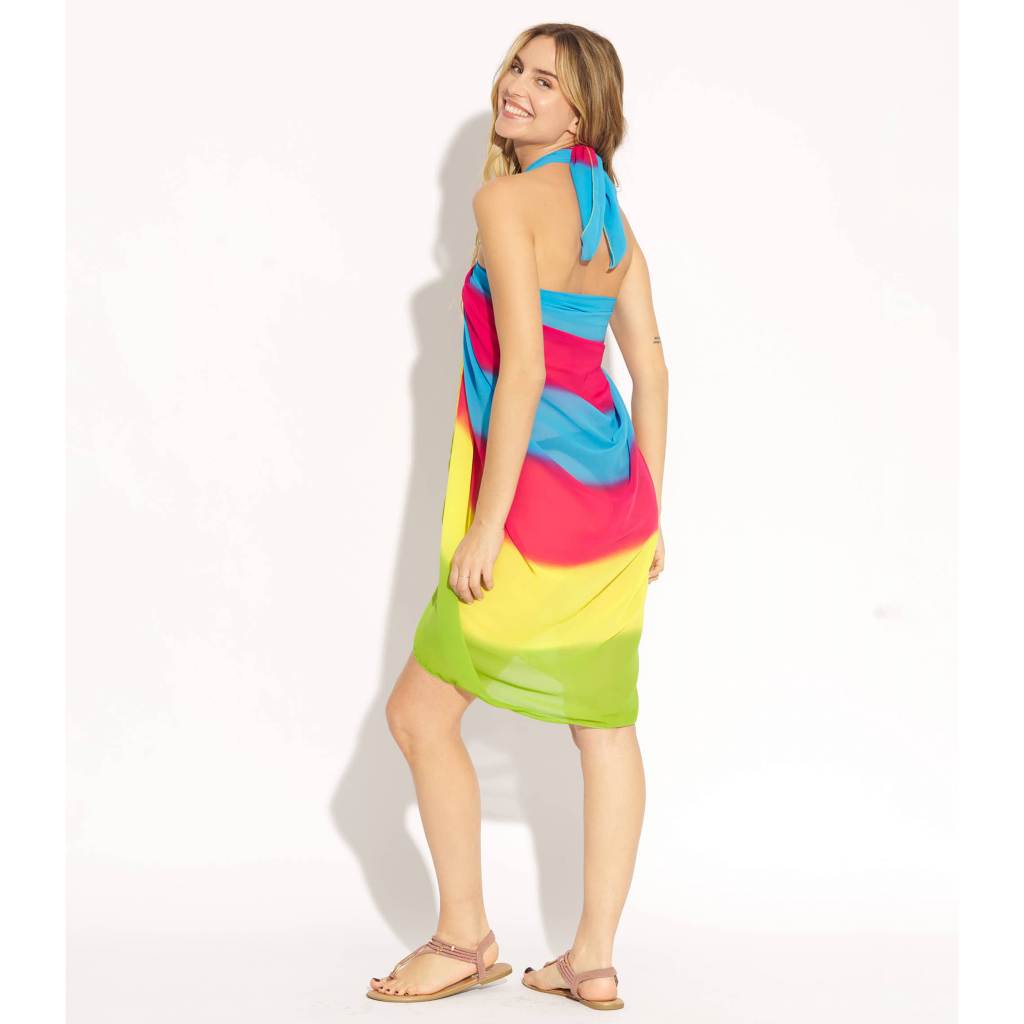 Step into summer with this vibrant multi-color shaded beach pareo featuring an elegant buckle for a secure and stylish fit. Designed in bold shades of blue, pink, yellow, and green, this breezy cover-up adds a splash of tropical charm to your beachwear. The lightweight Georgette fabric drapes beautifully, making it the ideal bikini cover-up, resort outfit, or casual poolside wrap.