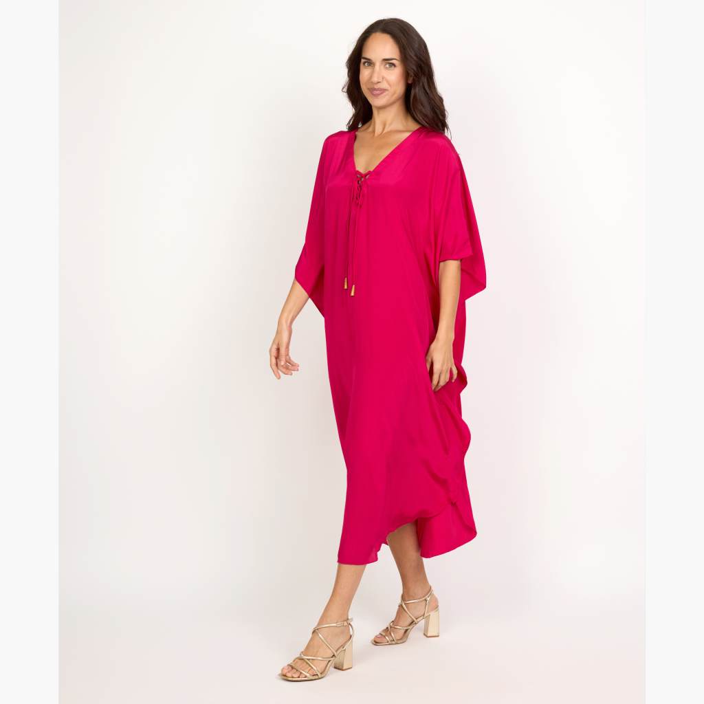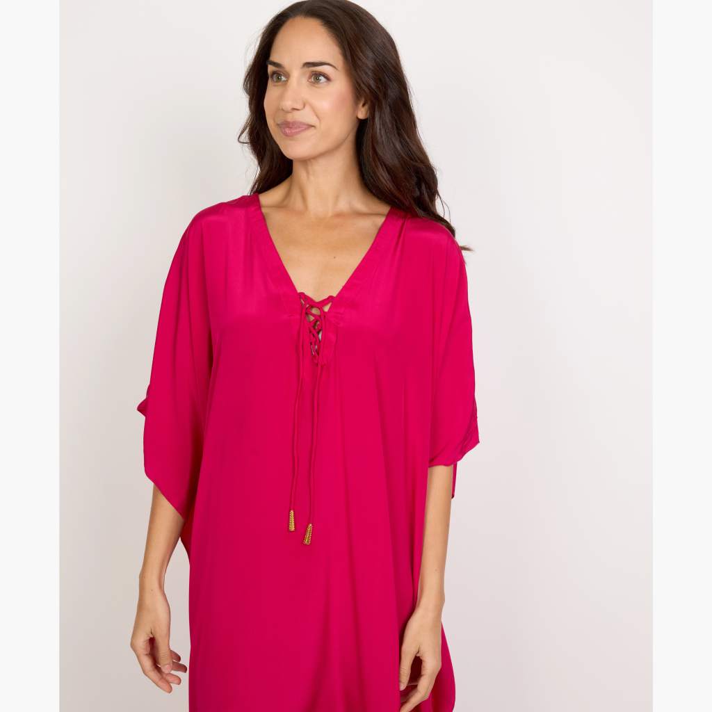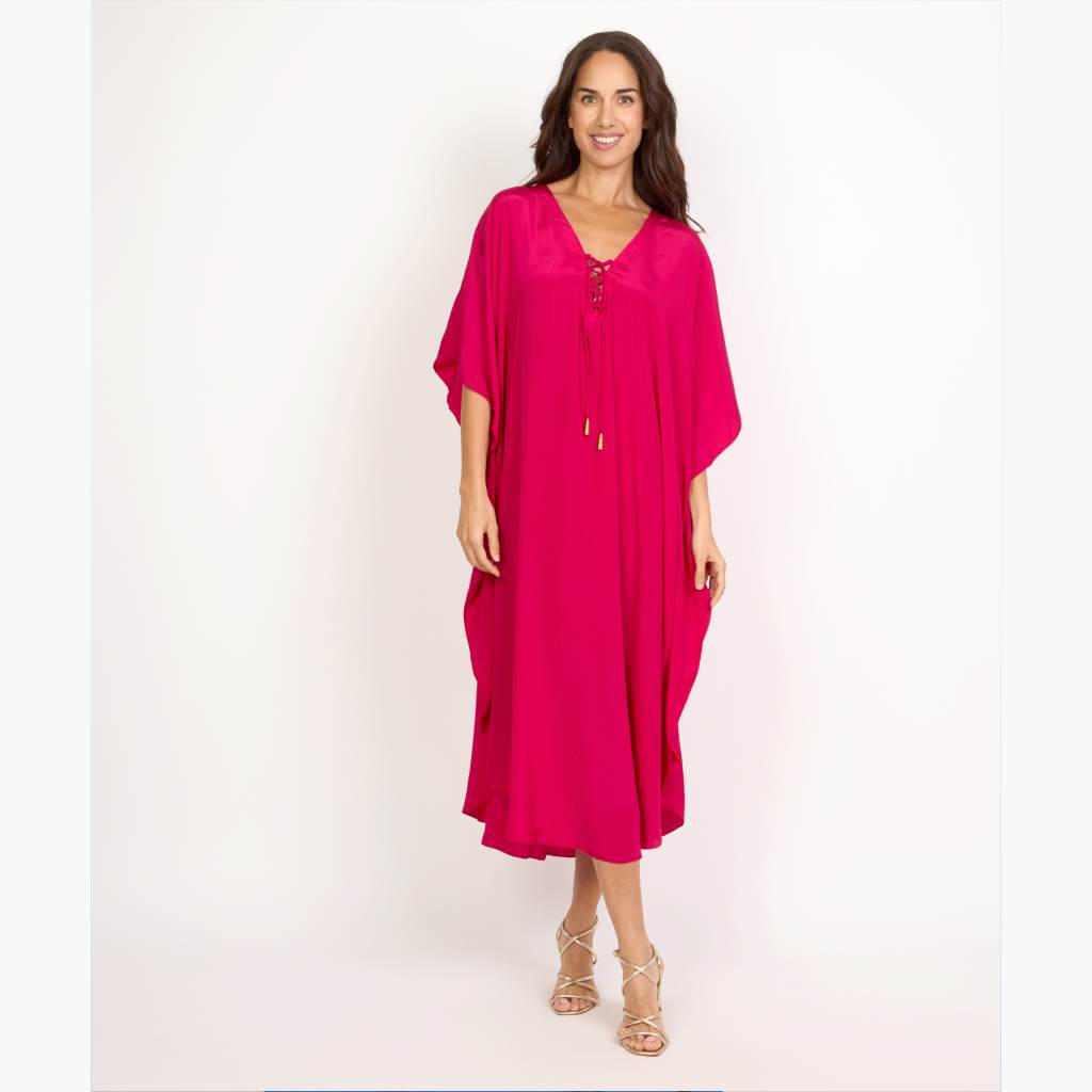 This rayon long kaftan features a flattering V-neck with lace-up detailing, offering a perfect blend of comfort and elegance. Designed in a breathable free-size fit, it’s ideal for lounging, vacations, or casual daywear.
