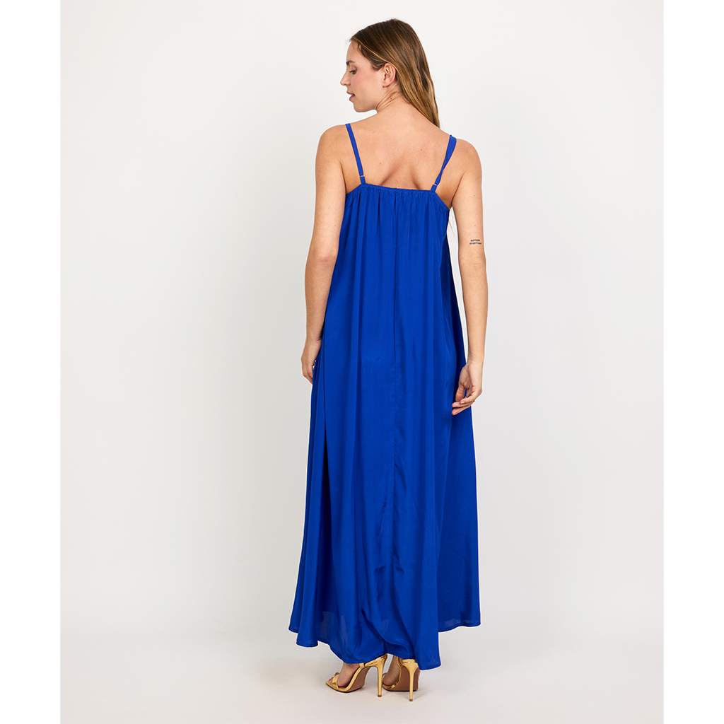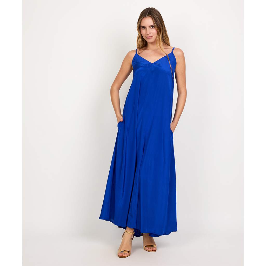 The V-Neck Strappy Dress captivates with its romantic silhouette & 2 side pockets. Crafted from luxurious crepe silk, it features adjustable straps for a customized fit and a graceful 50" length, making it a timeless statement piece.