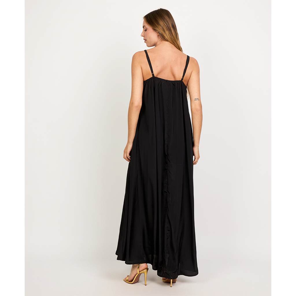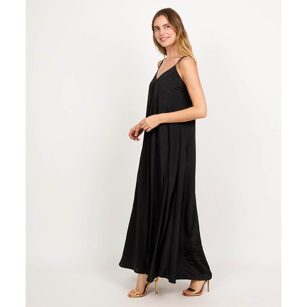 The V-Neck Strappy Dress captivates with its romantic silhouette & 2 side pockets. Crafted from luxurious crepe silk, it features adjustable straps for a customized fit and a graceful 50" length, making it a timeless statement piece.