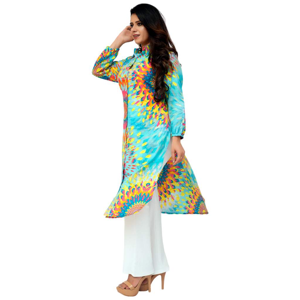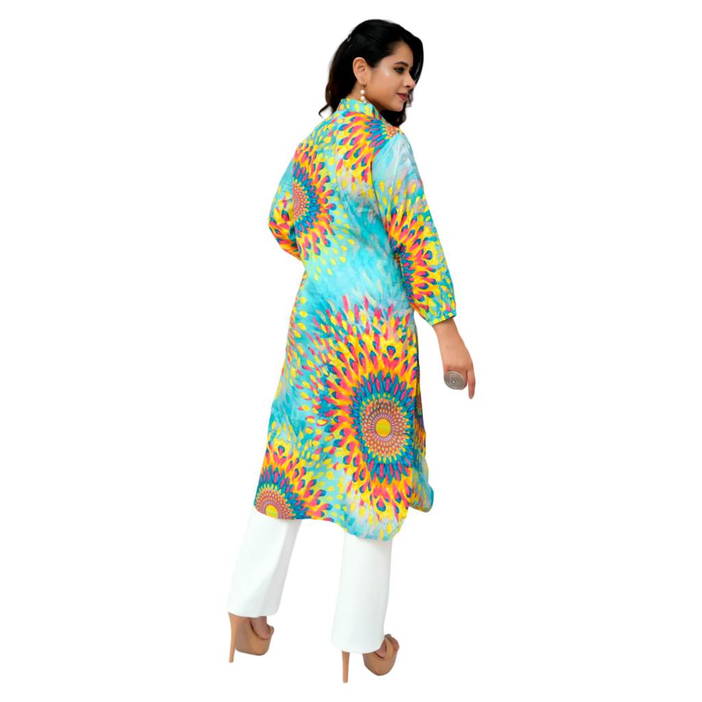 Add a splash of color to your everyday wardrobe with this Mandala Multi-Colour Kurti from SUN-ROSE Fashions. Featuring a beautiful mix of traditional mandala prints and a contemporary silhouette, this kurti is designed to keep you stylish and comfortable all day long. Crafted from lightweight, breathable fabric, it drapes effortlessly and works perfectly for casual outings, daily wear, or festive occasions. Pair it with palazzos, leggings, or denim to create your own look.